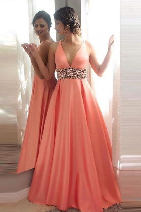 A-line Satin Long Pink Prom Gown Styles with Pearls Waistband