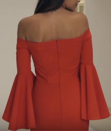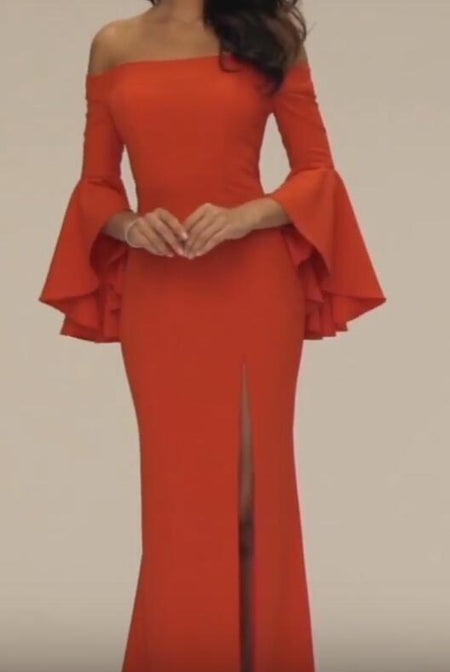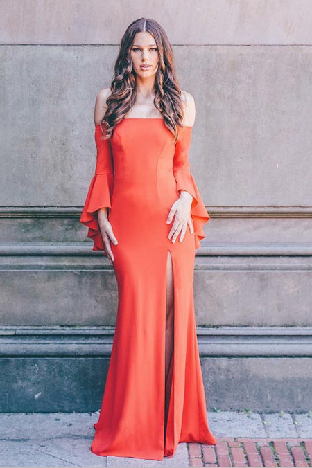 Floor Length Satin Orange Red Evening Gown Flare Sleeves