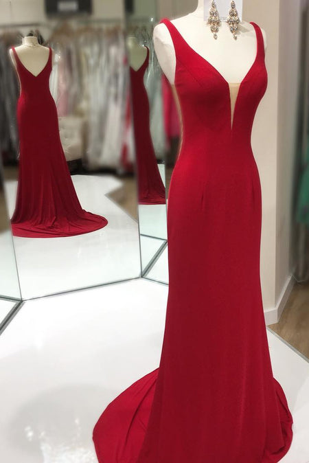 Hugging Bodice Long Red Prom Dresses with Plunging V-neckline