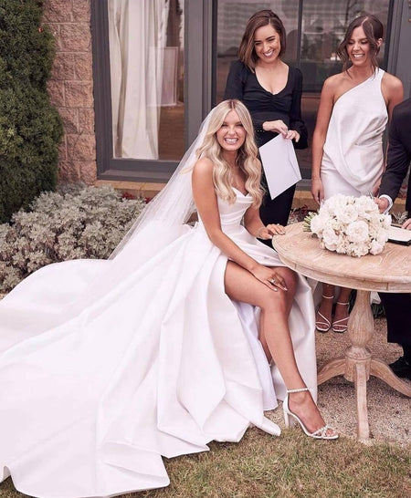 Ruching Strapless Satin Bridal Dress with Leg Slit