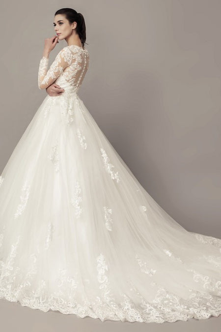See-through Long Sleeves Ball Gown Wedding Dress Lace Tulle Cathedral Train