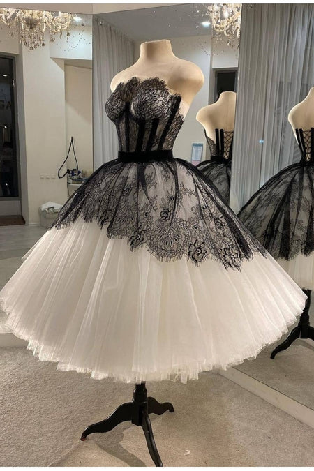 Strapless Short Ball Gown Wedding Dress with Black Lace